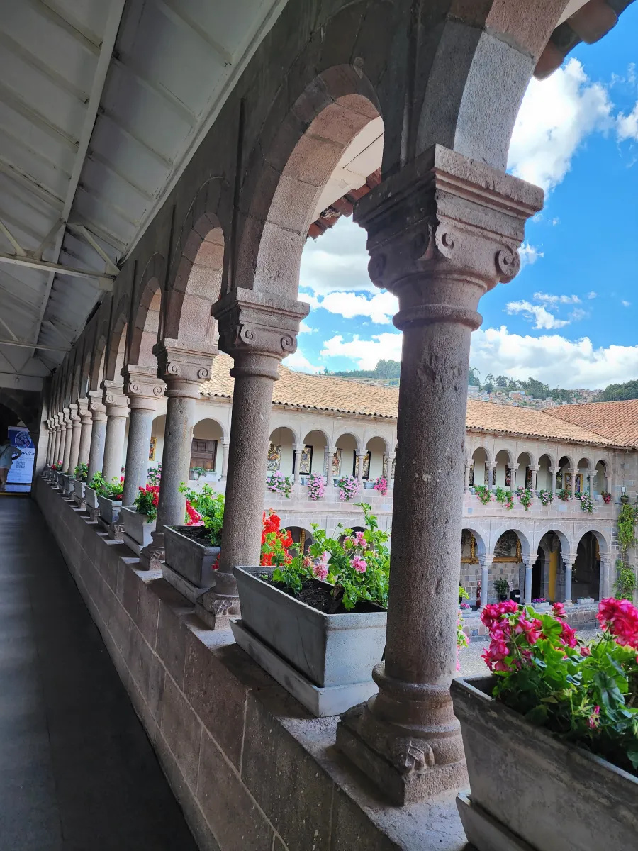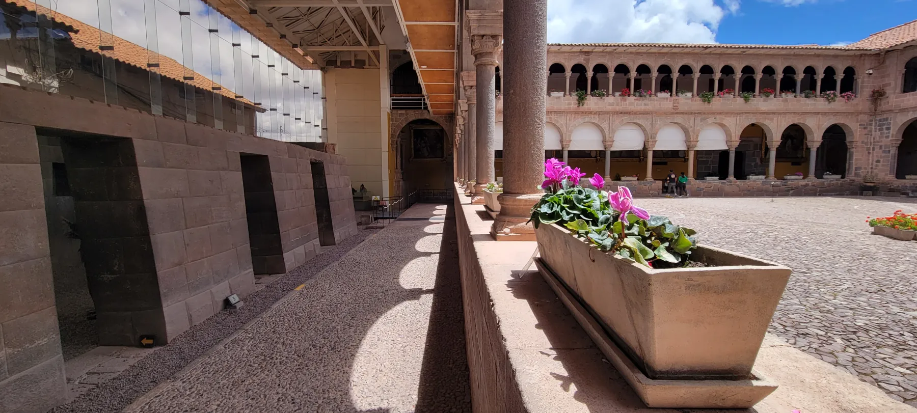 An elegant cloister with a central fountain. From here you can clearly see the contrasts: colonial arches above Inca walls that seem untouched by time.