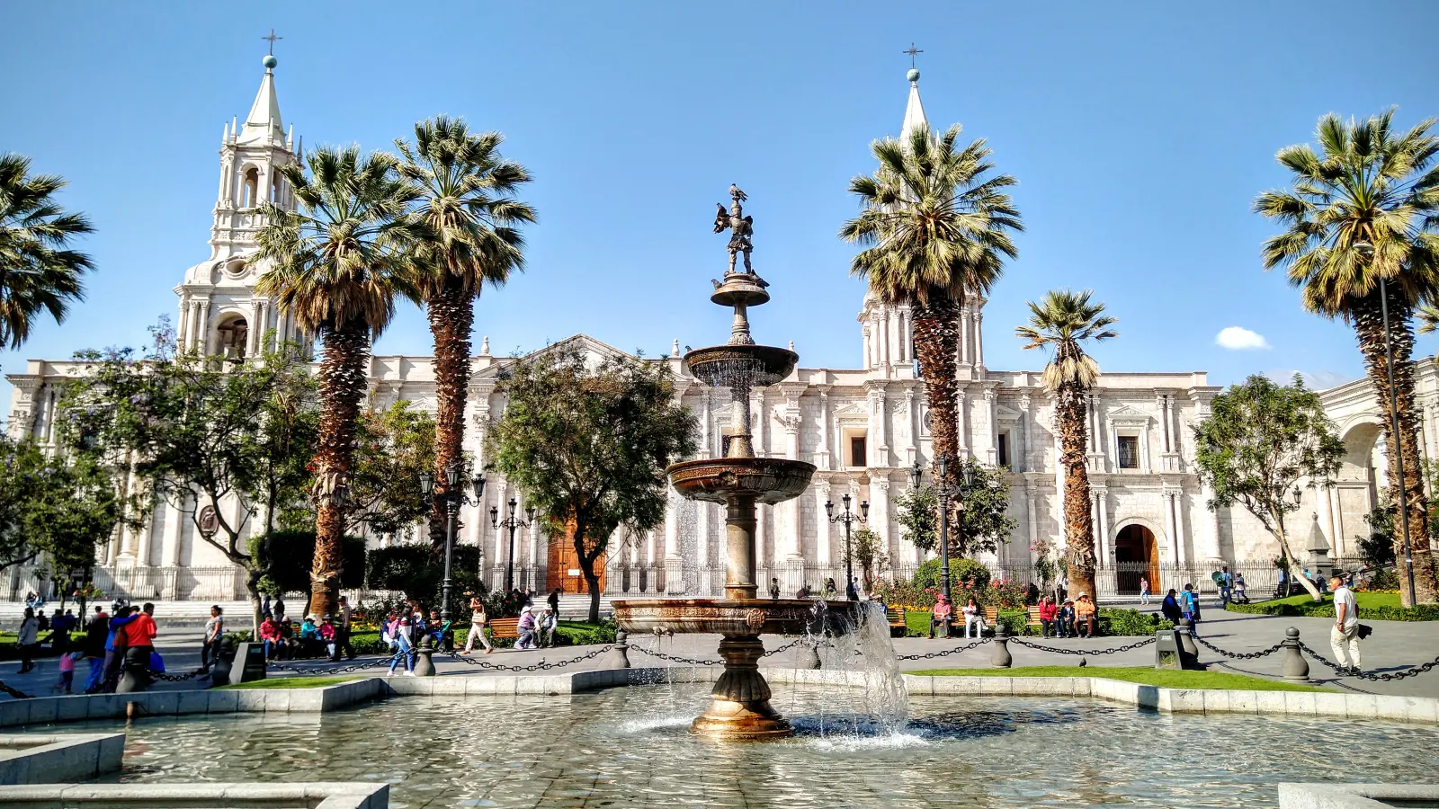 • Plaza de Armas Arequipa: El corazón de la ciudad, rodeada de arcos coloniales y edificios de sillar blanco. Aquí, la Basílica Catedral de Arequipa, de estilo neorrenacentista y construida en 1656, impresiona con su fachada y torres gemelas. Es un lugar vibrante, con fuentes y jardines que invitan a pasear.