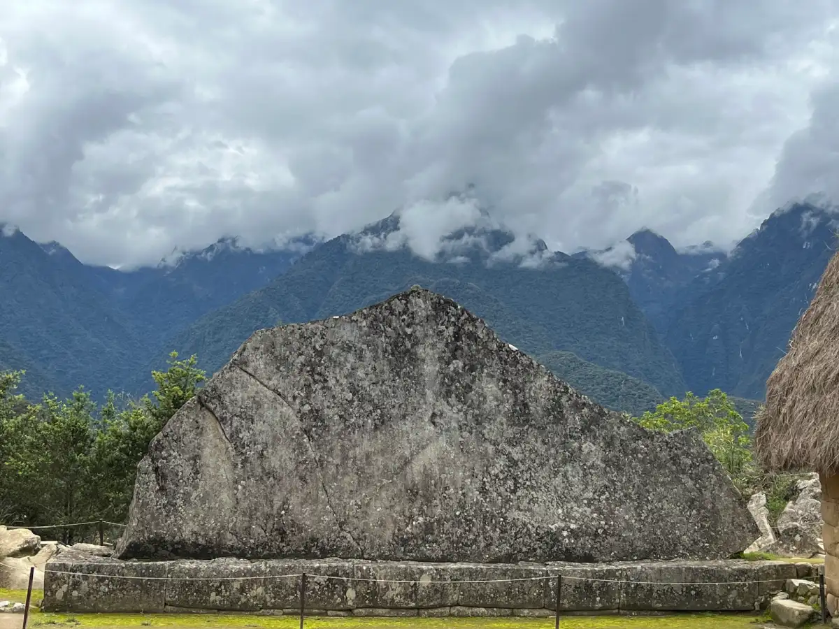 La roca sagrada Machu Picchu es un enorme bloque de piedra que guarda relación con las montañas que rodean la ciudadela. Se cree que representaba un elemento espiritual vinculado al paisaje andino.