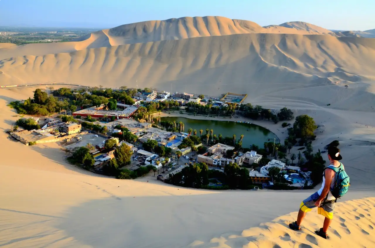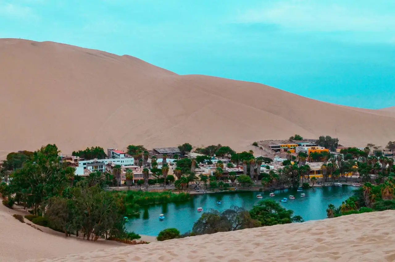 Huacachina es el único oasis natural del Perú y uno de los destinos más fotogénicos del desierto sudamericano. Sus dunas de gran tamaño permiten realizar paseos en buggy en Ica y practicar sandboarding en condiciones ideales.